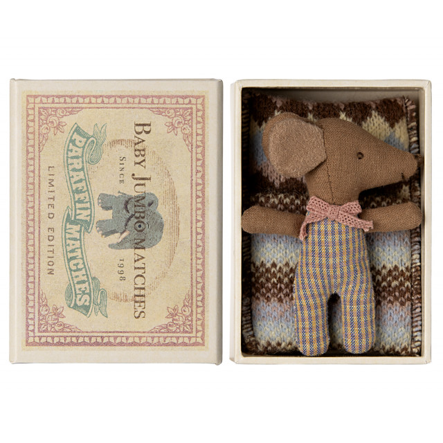 Babymusen ligger i en fin tändsticksask där den kan sova.