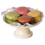 Macarons serveras på ett fint lite högre serveringsfat som är handmålat.