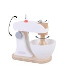 En leksaks mixer utav trä som kommer med en matblandare med roterande visp och en avtagbar blandningsskål.
